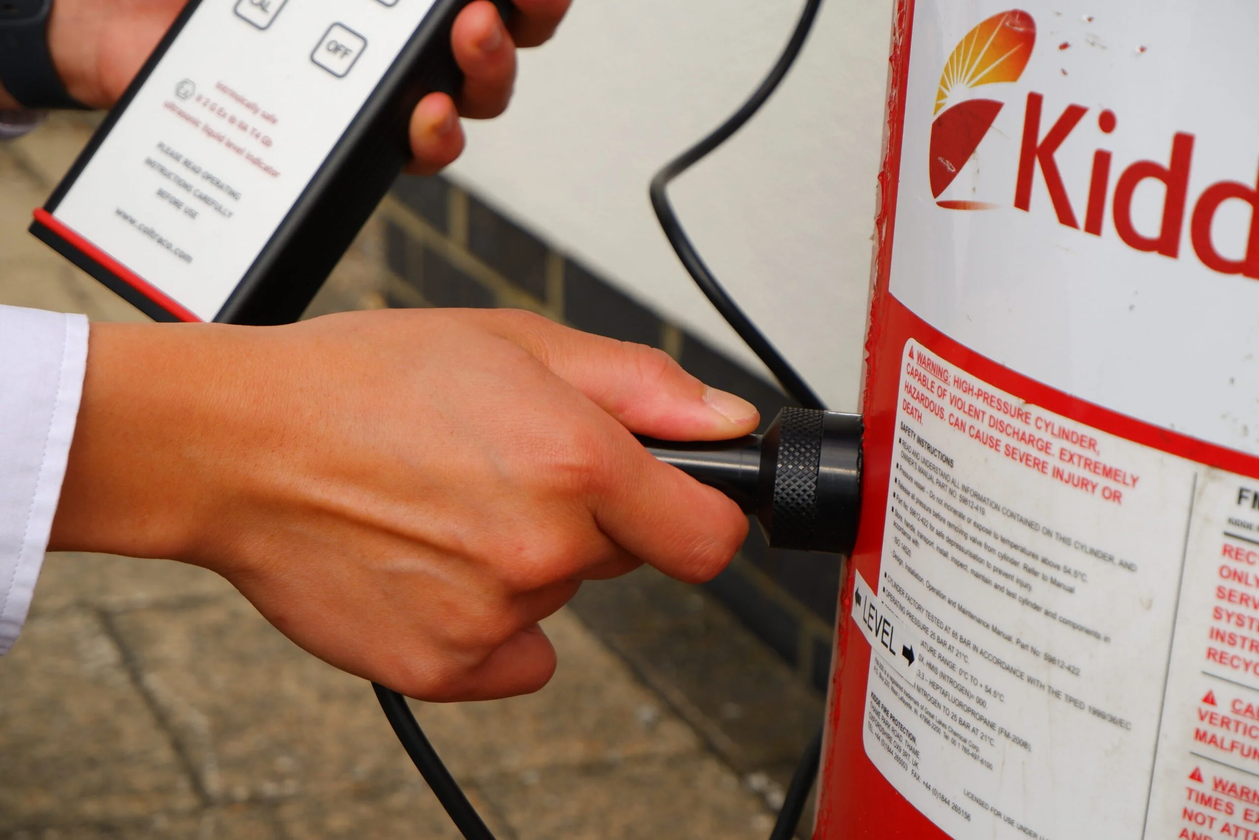 An intrinsically safe ultrasonic device for non-invasive monitoring of fire suppression cylinders in hazardous environments. Approved for ATEX Zone 1 and Zone 2, certified to ATEX II 2 G Ex ib IIA T4 Gb and IECEx (Ex ib IIA T4 Gb) standards.