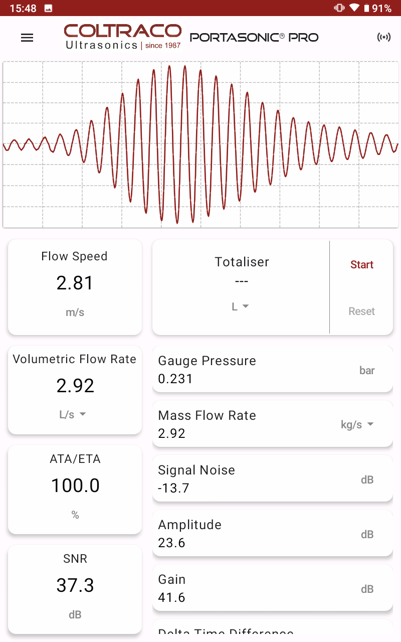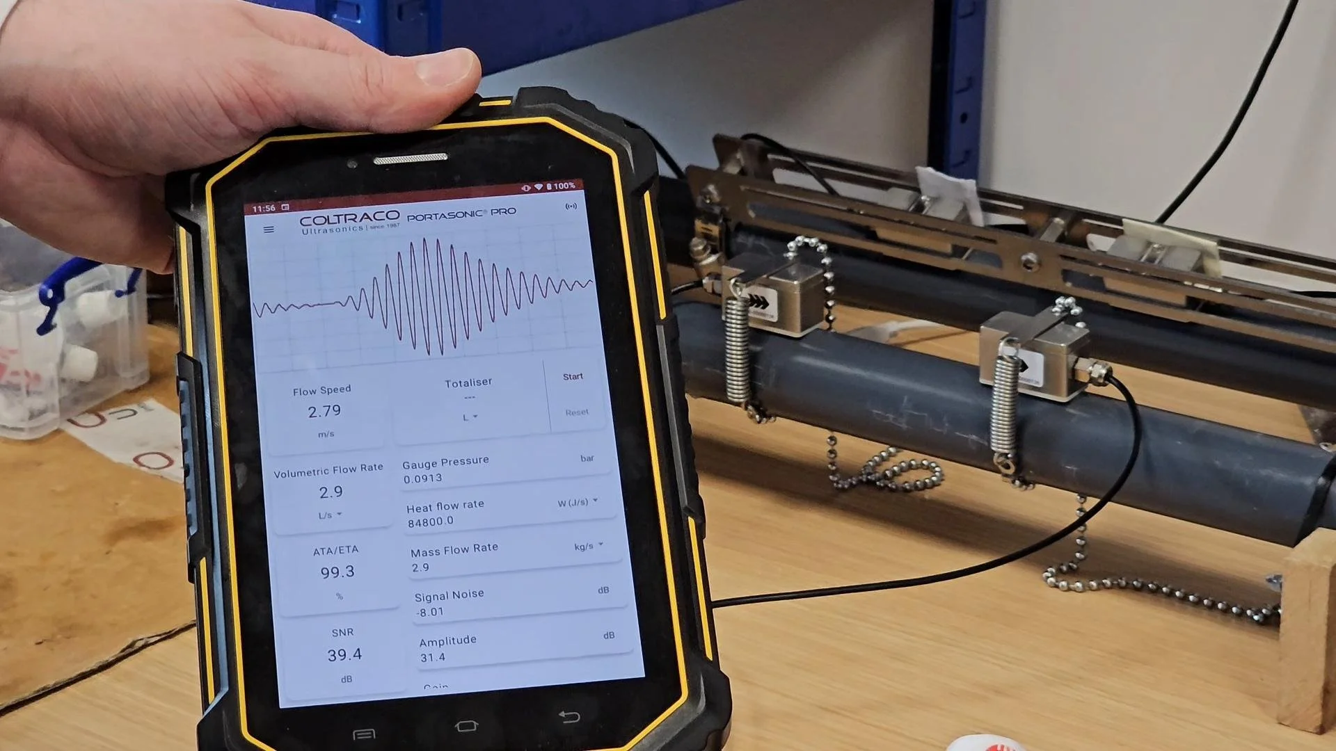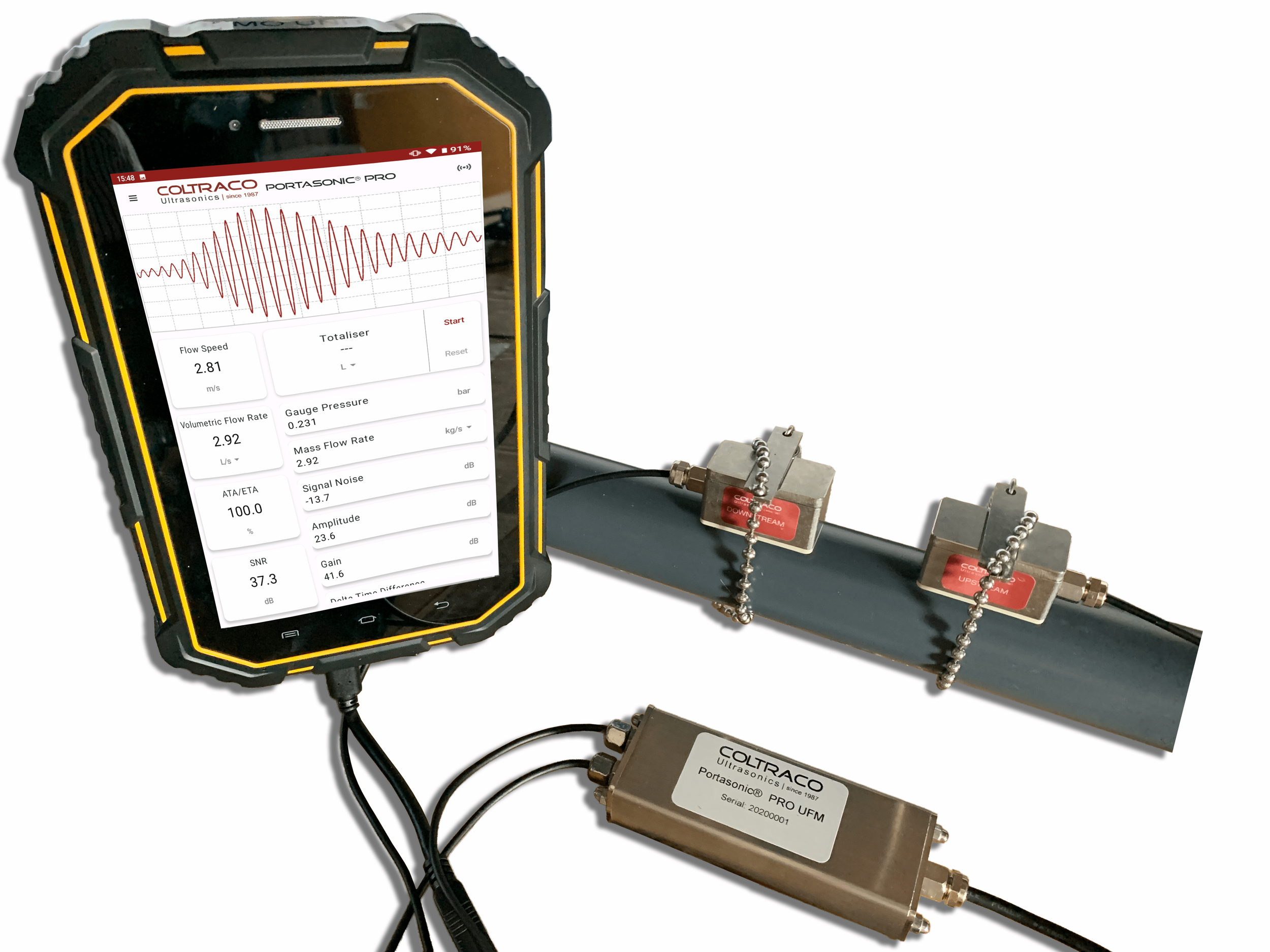 The Portasonic® PRO is a portable, tablet‑operated ultrasonic flow meter designed for clamp‑on measurement and equipped with advanced software that estimates internal pipe pressure based solely on recorded flow data. By combining non‑intrusive flow monitoring with predictive pressure analysis, it brings together the capabilities of the Portasonic® flow meter and the Portasonic® Calculator. The result is the first device able to estimate internal pipe pressure using only external, non‑contact ultrasonic sensors.